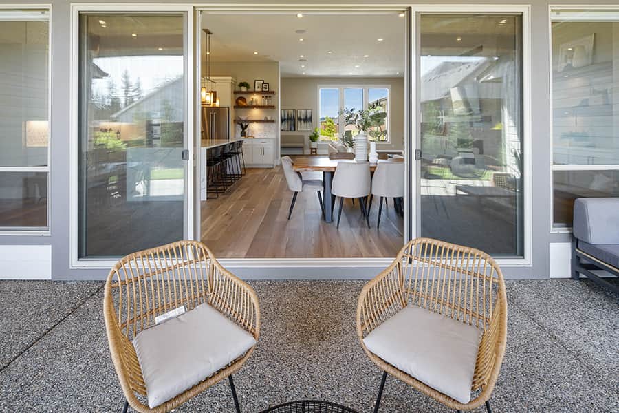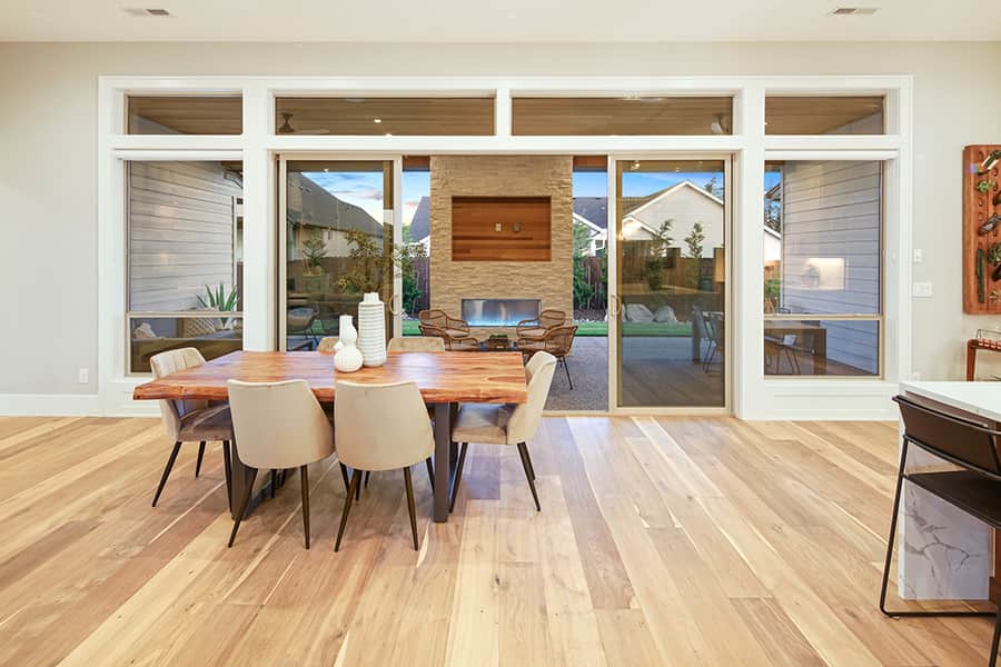 Step into the great room and you’re welcomed by volume ceilings, oversized windows, and a sense of calm. A statement fireplace anchors the space, while 16-foot sliding glass doors open to a covered outdoor living area with a second fireplace. Natural light moves easily through the open layout, creating an atmosphere that is both expansive and inviting.