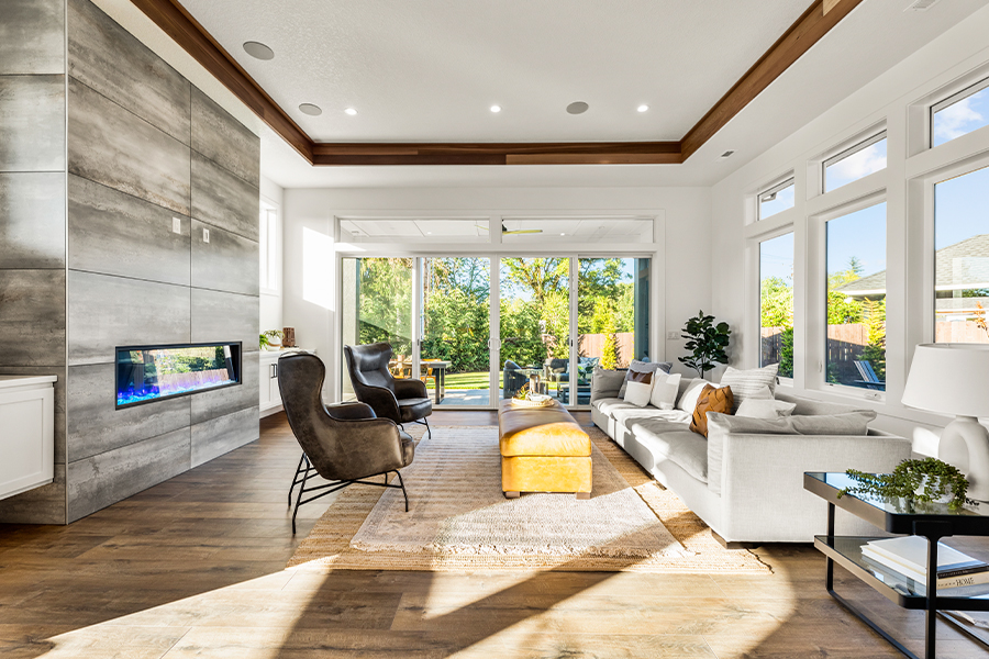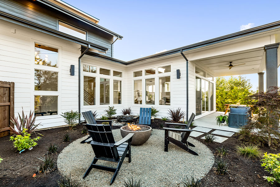 Large sliding doors open to a covered outdoor living space with a vaulted wood ceiling, ceiling fans, and a fireplace. This area functions like a second great room, offering comfort and privacy for everything from quiet mornings to weekend entertaining. It extends the home’s livable square footage in the best possible way.